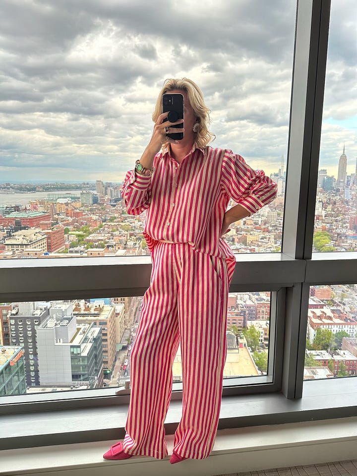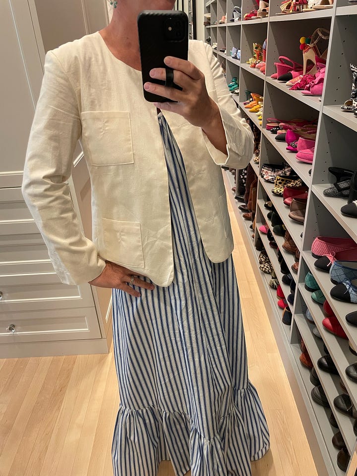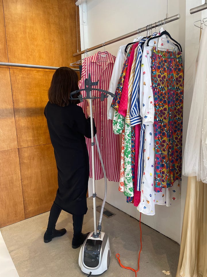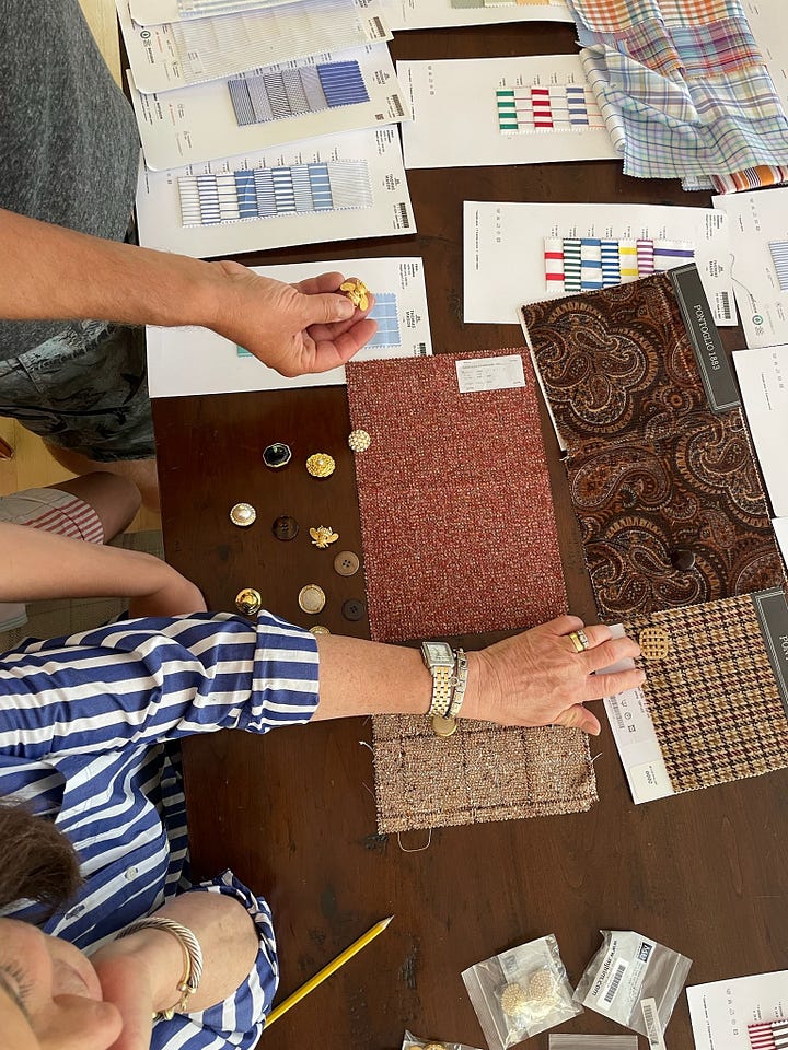 I had no idea how to begin sourcing fabrics, let alone how to get anything actually produced, so I reached out to a designer friend in New York. She graciously offered so much guidance and introduced me to several trusted mills and factories. In November of 2022, I made my first sourcing trip to New York. It was exciting and nerve wracking and I’d be lying if I didn’t say I felt a bit of imposter syndrome sitting in the NYC offices of European mills. With my Retrouvai pinky ring with a flying pig on it, engraved on the inside with “Anything is possible” and decked out in my favorite vintage Chanel blazer, I played the part, but was honest that I was naive to timelines and MOQs, amongst many other acronyms. When I told the mills that I planned to launch a preorder in April 2023 to ship summer of 2023, most looked at me like I had a third eye, but in this instance my naivete served me well. Looking back, I now realize how insane it was to turn a collection around in 5 months.