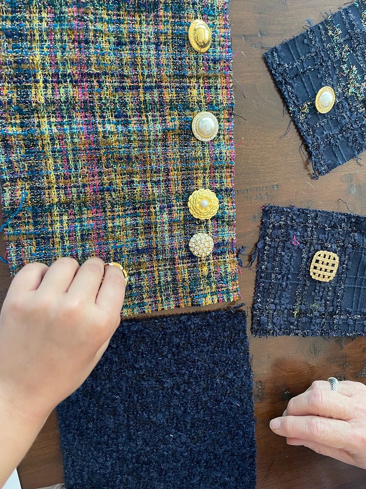 From left to right: My first sourcing trip to New York; sampling fabric and buttons; one of my first blazer samples.